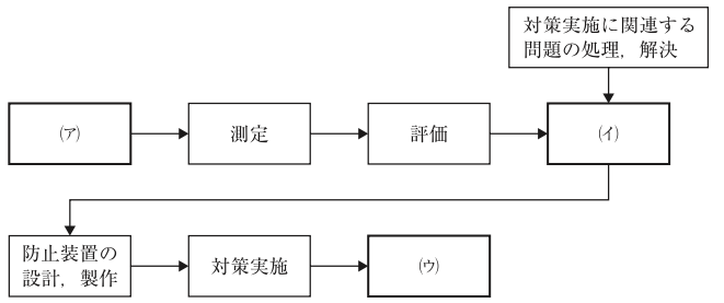 下図は,騒音が問題になっている場合に,問題を経済的に解決するための騒音対策の進め方を表したものである。(ア)〜(ウ)の中に挿入すべき語句の組合せとして,最も適切なものはどれか。