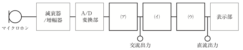 下図は,ディジタル表示の一般的な騒音計の構成を示したものである。(ア)〜(ウ)の中に挿入すべき語句の組合せとして,正しいものはどれか。