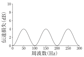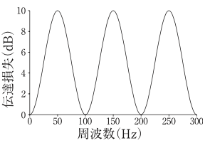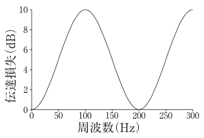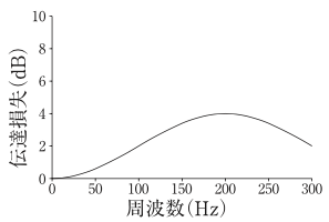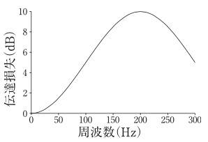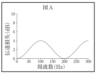 伝達損失が図Aで表される膨張形消音器がある。この消音器の膨張比は変えずに,空洞の長さを2倍にした場合の伝達損失の周波数特性として,正しいものはどれか。