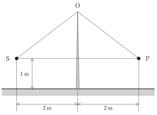 工場内の機械に,周波数1020Hzの純音性の騒音を発する全指向性点音源Sがある。点音源Sと測定点Pとの間には,下図のように高さ2.5mの塀(地表面から頂点Oまでの高さ)が設置されている。測定点Pでの騒音レベルを低減する必要が生じたことから,塀の高さを5mに変更することを計画している。この変更により,騒音レベルは約何dB低減するか。ただし,塀の長さは十分に長く,また,塀からの透過音及び地表面での反射音は無視できるものとする。音速を340m/s,√5=2.24として計算せよ。