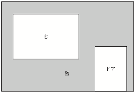 面積が40m\(^{2}\)の壁がある。この壁に,下図のように,面積が10m\(^{2}\)の窓を1つ,面積が5m\(^{2}\)のドアを1つ取り付けた。それらの音響透過損失が下表のとおりであるとき,この壁面の総合音響透過損失は約何dBか。