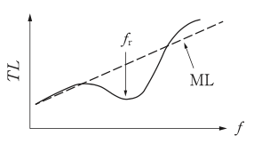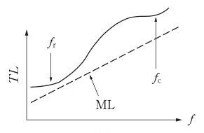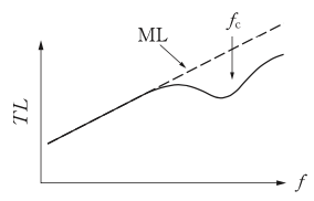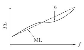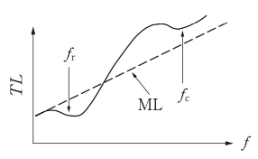 単層平板など密実な一重構造の遮音材料の音響透過損失(TL)の周波数特性として,最も適切なものはどれか。周波数特性の破線で示したMLは質量則であり,\(f_{r}\)は低音域共鳴周波数,\(f_{c}\)はコインシデンスの限界周波数である。